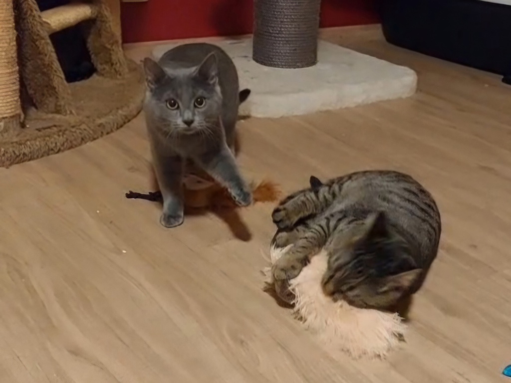Wir sind etwa 6 Monate alt, freundlich und – ganz jungkatzentypisch – verspielt und voller Energie. Gemeinsam erkunden wir die Welt, toben miteinander und genießen unsere kleinen Abenteuer.