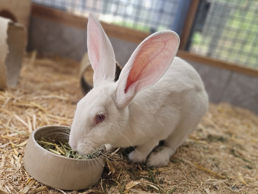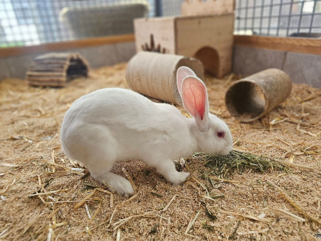 Hallo, ich bin Leo – ein junger, schneeweißer Rex-Bub mit kuschelweichem Fell und roten Äuglein, die neugierig in die Welt blinzeln. Ich bin schon jetzt ein ziemlich großer Kerl und werde bestimmt noch ein bisschen wachsen, deswegen wünsche ich mir ein Zuhause, in dem genug Platz für meine langen Sprünge und Haken ist. Ein schönes, großes Gehege – drinnen oder draußen – wäre genau das Richtige für mich, damit ich nach Herzenslust hoppeln und die Welt erkunden kann.