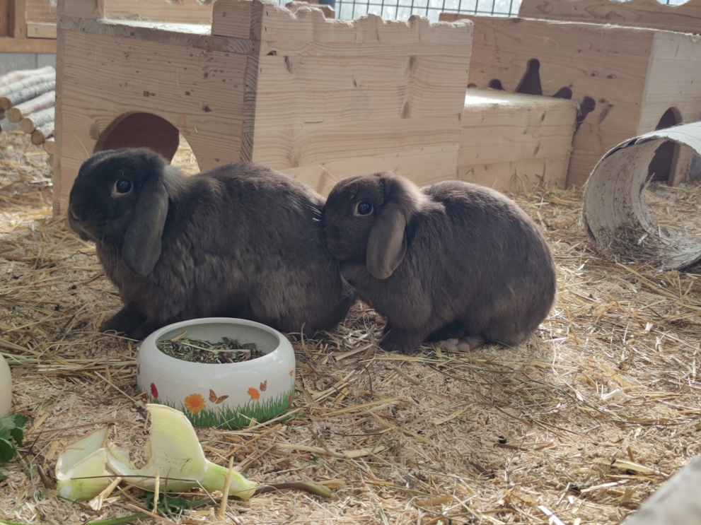 Wir sind anfangs etwas zurückhaltend bei neuen Menschen, aber grundsätzlich zwei neugierige, freundliche und aufgeschlossene Kaninchen, die gemeinsam auf der Suche nach einem neuen Zuhause sind. Wenn wir uns erstmal ein bisschen kennengelernt haben, werden wir sicher die besten Freunde. Wir zwei sind ein gutes Pärchen..wir verstehen uns prima und wünschen uns einen Platz, an dem wir zusammen alt werden dürfen.Unser Traumzuhause? Das sollte auf jeden Fall genug Platz zum Hoppeln, Toben und Entspannen bieten – am liebsten mit einer geschützten Außenhaltung und einem sicheren Innenbereich, in dem wir bei schlechtem Wetter oder in der kalten Jahreszeit Unterschlupf finden können. Frische Luft, Sonne und ein schattiges Plätzchen gehören für uns einfach dazu! Wir sind sehr interessiert an allem, was um uns herum passiert, und erkunden unsere Umgebung mit großer Neugier. Menschen gegenüber zeigen wir uns offen und freundlich – wenn man uns ein bisschen Zeit lässt, kommen wir gerne von selbst zum Kuscheln vorbei.
