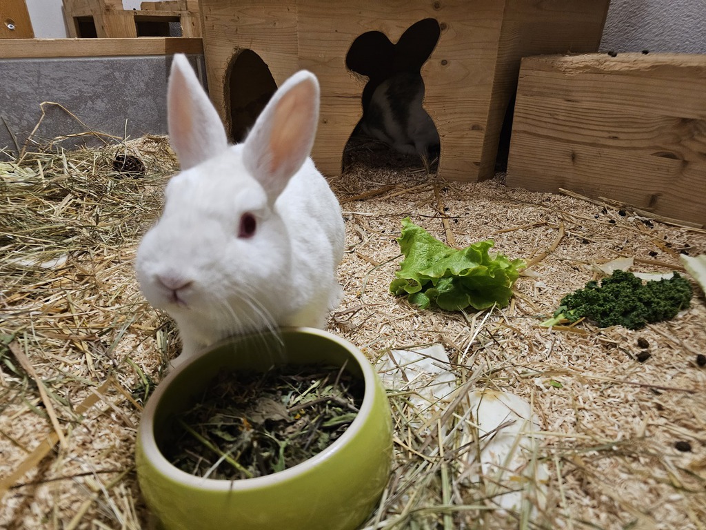 Pflaume und ich mögen es entspannt und genießen ruhige Stunden in unserem Gehege. Doch wenn es um leckere Snacks geht, sind wir plötzlich ganz aufmerksam! Mit ein wenig Geduld und liebevollen Streicheleinheiten werden wir bestimmt tolle Begleiter für eine Familie, die uns Zeit gibt, Vertrauen zu fassen. Wir wünschen uns ein artgerechtes Zuhause mit viel Platz zum Hoppeln, Verstecken und Kuscheln – am liebsten natürlich gemeinsam, denn wir sind ein eingespieltes Team. Wenn du uns kennenlernen möchtest, freuen wir uns auf dich!